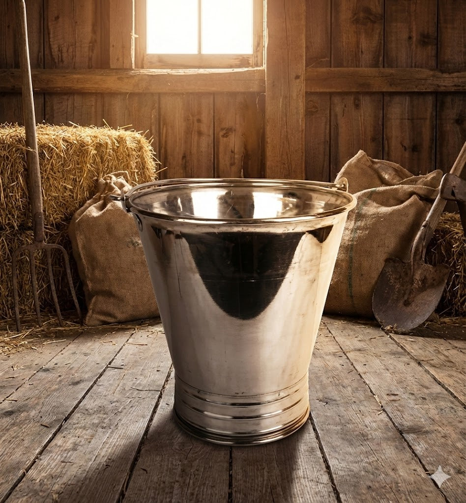 large, heavy-duty metal bucket made of polished stainless steel, designed for durability and a high-shine...