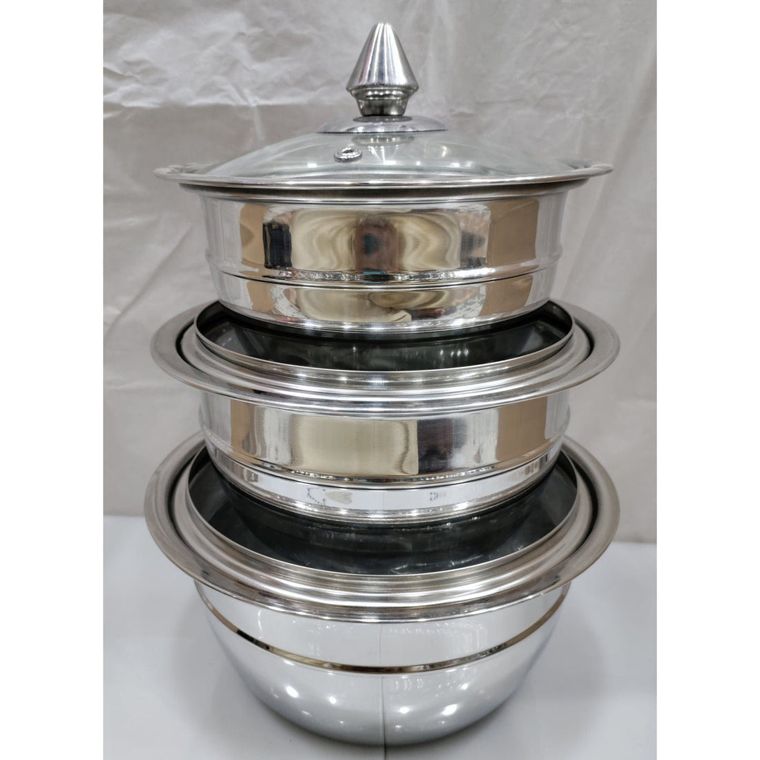 Stainless Steel Stackable Serving Bowls with Glass Lids (3 pc set)