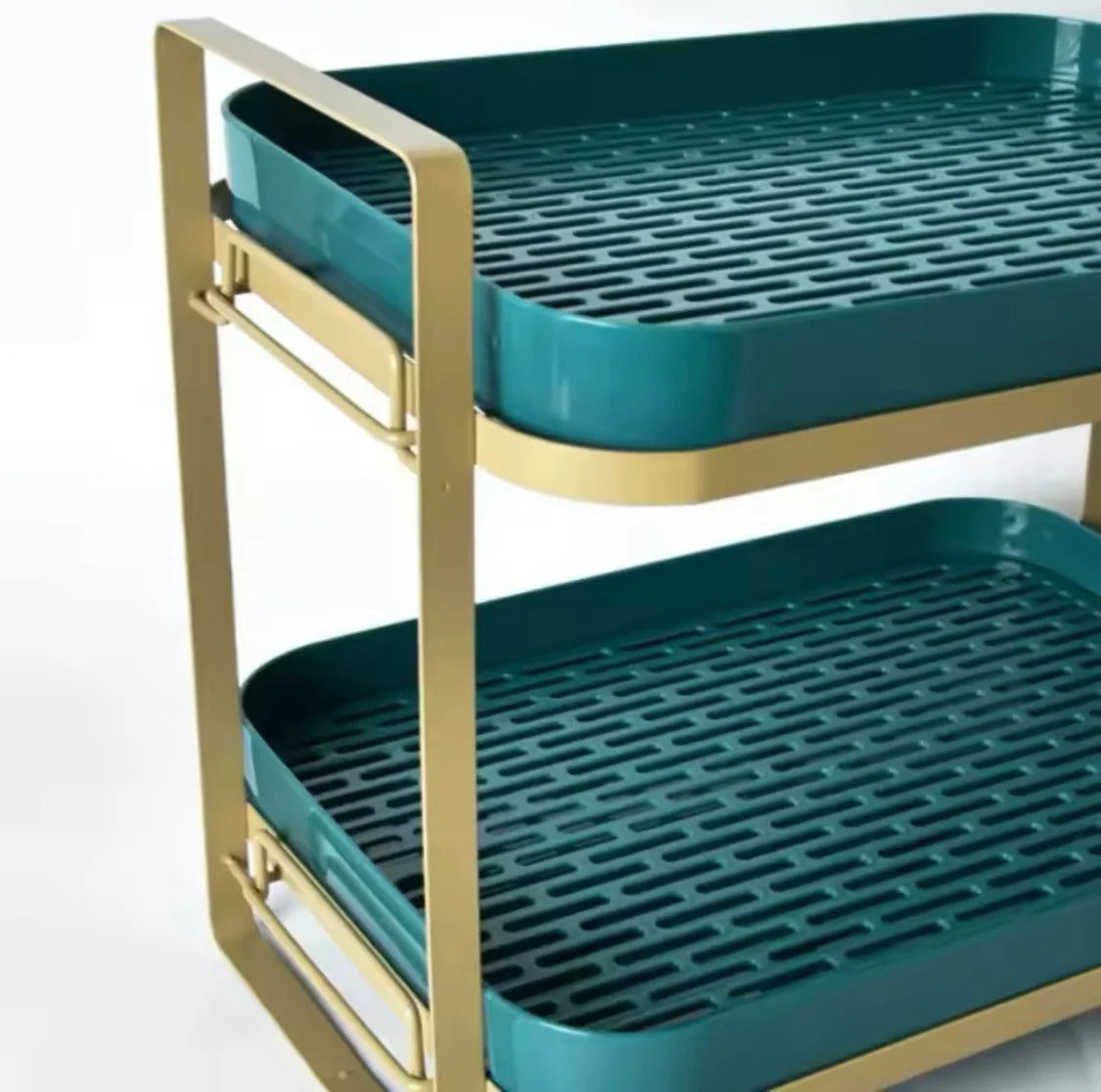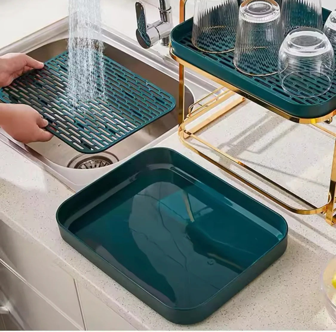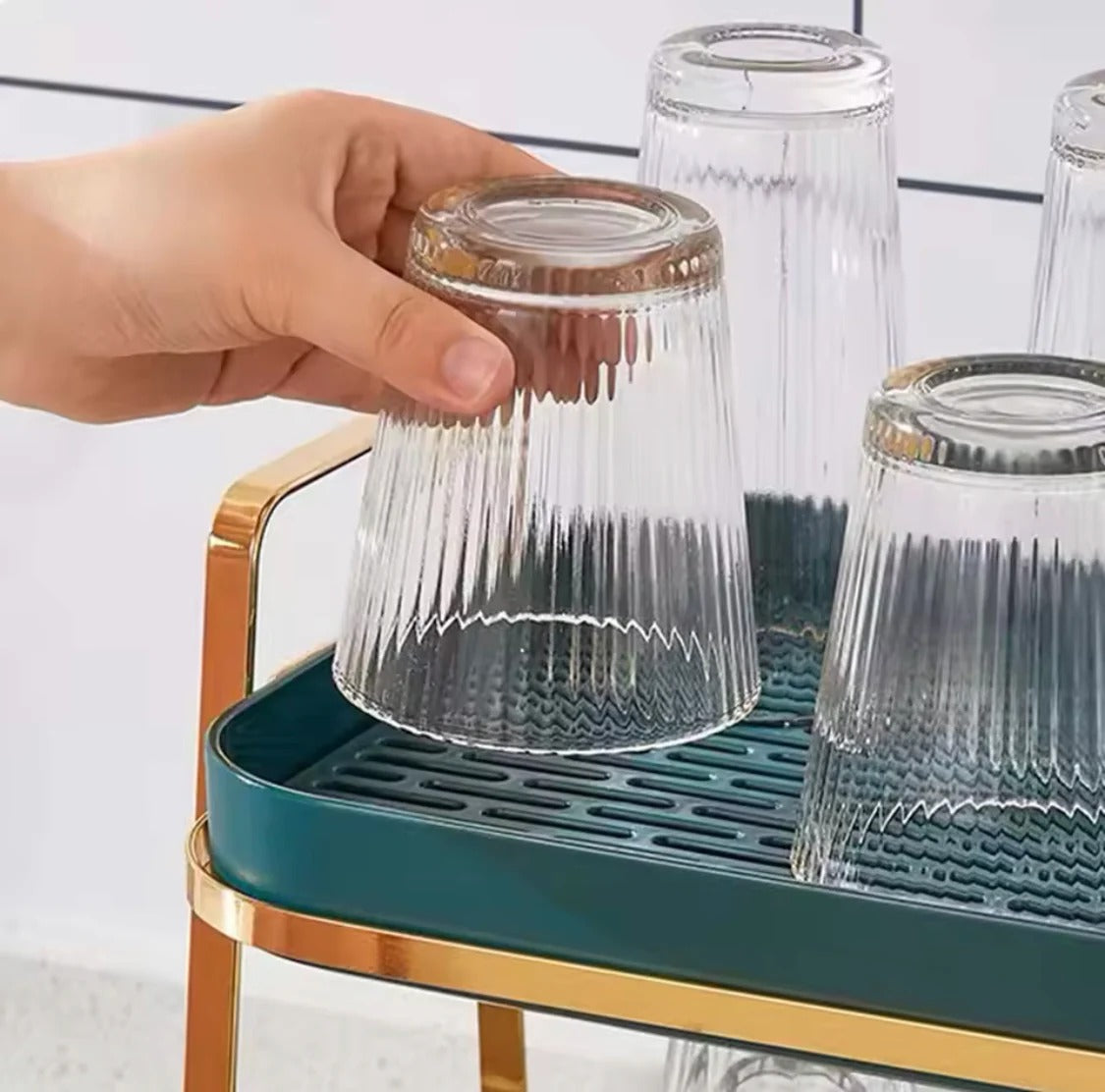 This double-deck kitchen countertop rack is an ideal solution for maximizing kitchen space and organization. It provides a practical drying rack for cups and mugs, featuring a built-in drip tray to collect excess water and keep your countertop clean. Additionally, space for spice jars, ensuring easy access and a clutter-free kitchen. Constructed from durable materials, this stylish organizer enhances both functionality and aesthetics, making it a perfect addition to any kitchen setting.
