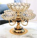 Elevate your entertaining with this luxurious 5-tier dry fruit serving stand. Featuring a stunning central crystal bowl surrounded by four smaller crystal dishes, all elegantly supported by a rich gold-finished base. Perfect for showcasing fruits, nuts, candies, and treats, adding a touch of sophistication to any table setting or special occasion. (Please note: This model is stationary and does not rotate.)