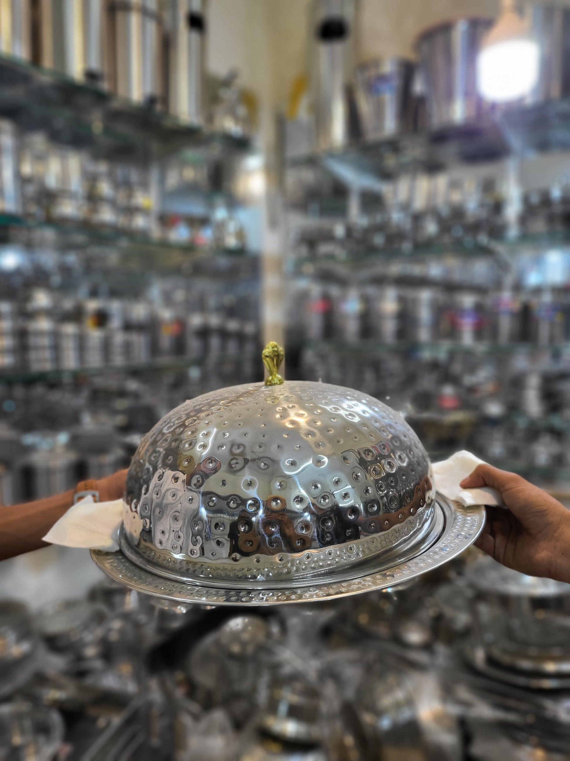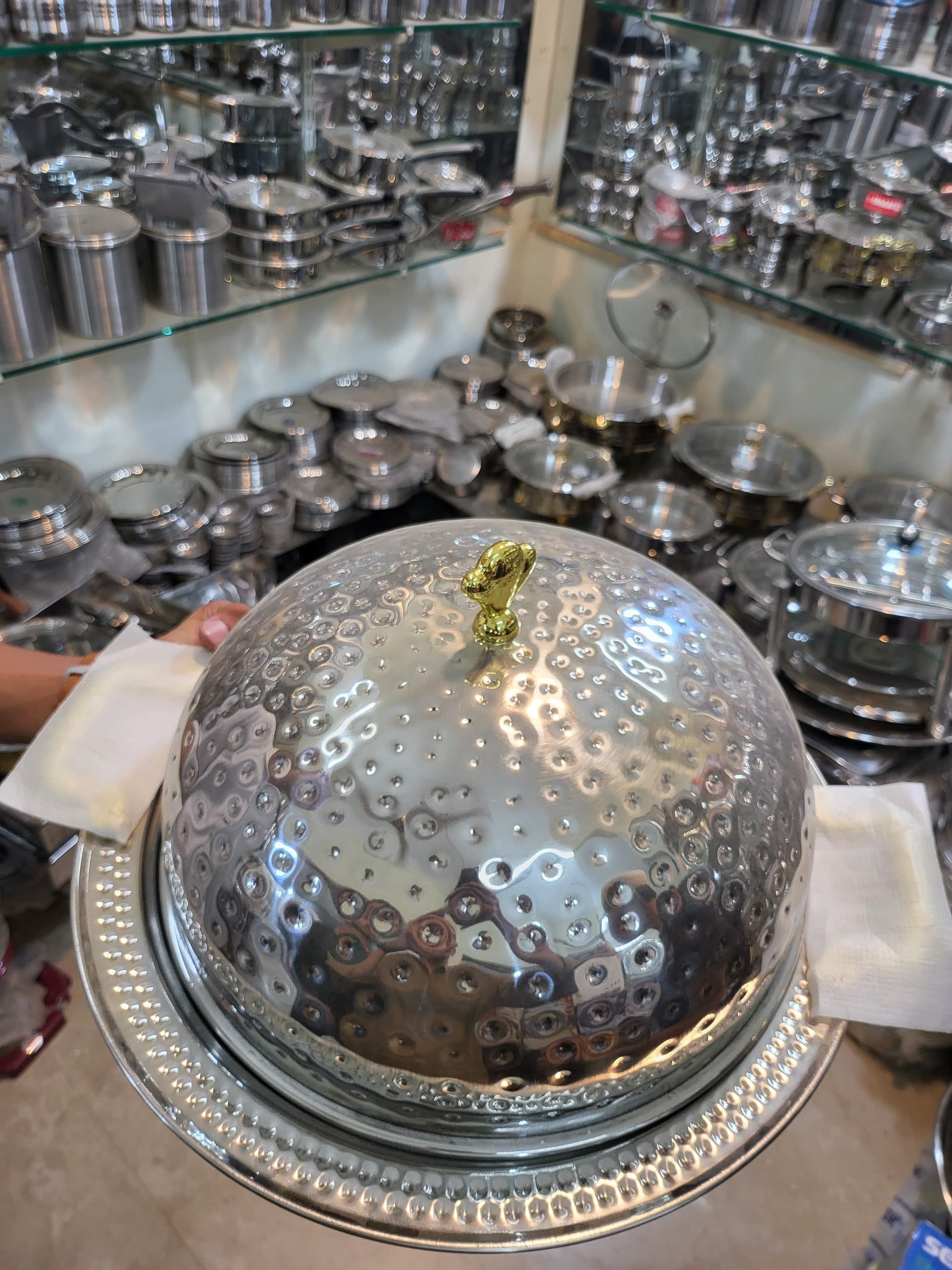 Present your culinary creations with elegance using this exquisite hammered stainless steel serving platter with a matching dome lid. Perfect for keeping BBQ, roasts, rice dishes, and other entrees warm and beautifully presented for family gatherings or festive occasions. The unique hammered texture on the lid adds a sophisticated touch, while the sturdy construction ensures durability for years of use. Ideal for both everyday dining and special events, this platter is a functional and visually appealing addition to any dining table.