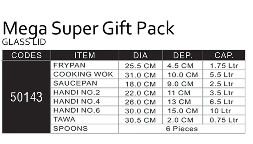 A 18-piece multifunctional set that features our Frypan, Cooking Wok, Saucepan, 3 Casseroles (Handi), Tawa, and Spoon. Ideal for those looking for a kitchen upgrade.